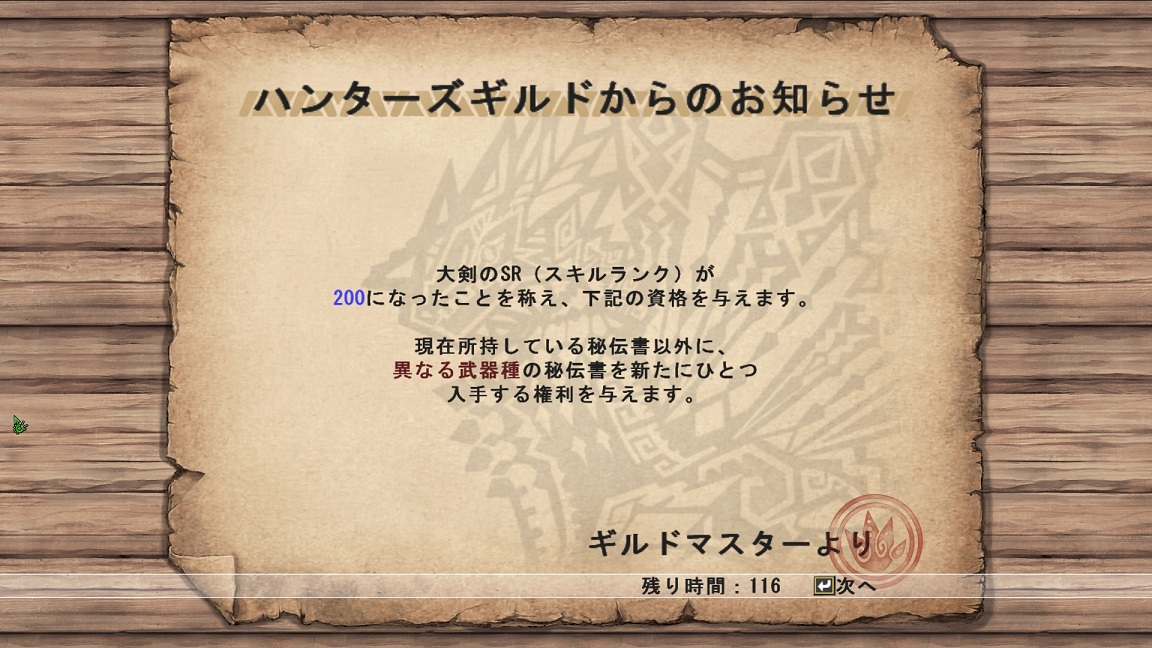 武器は進化武器が大正義なんで、双剣のゲキが燦然LV100分まで貯まったら大剣を作ろうと思います。