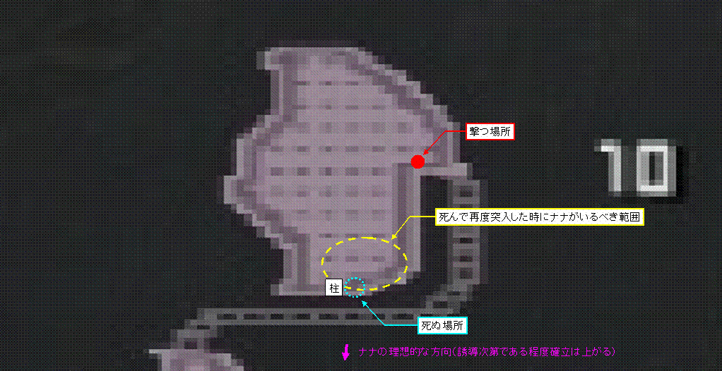 誘導する時は、ナナの突進または飛びかかりで乙るようにするのですが、その角度を調整してうまくナナが柱横で矢印の方向で終わるようにします。